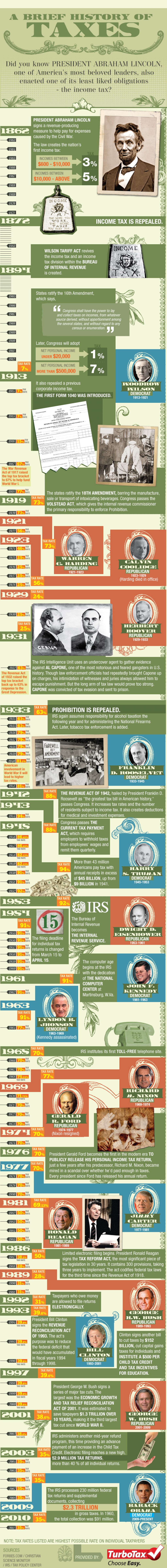 For all you inquiring minds, here is an quick history of the income tax in the U.S. Please note that the rates shown are the highest marginal tax rates at the time. For example, in 1954, the 91% marginal rate would have been applied only to the income over $400,000.
